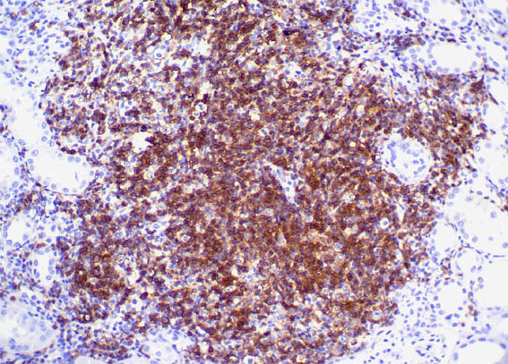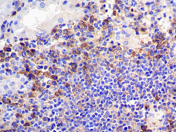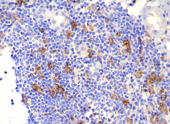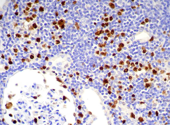 Figure 12. Immunohistochemistry for CD38, X400.