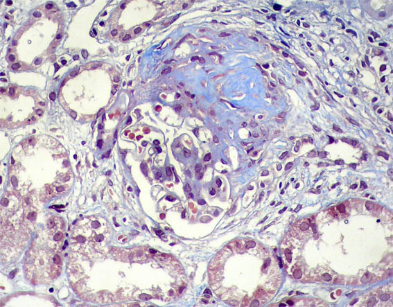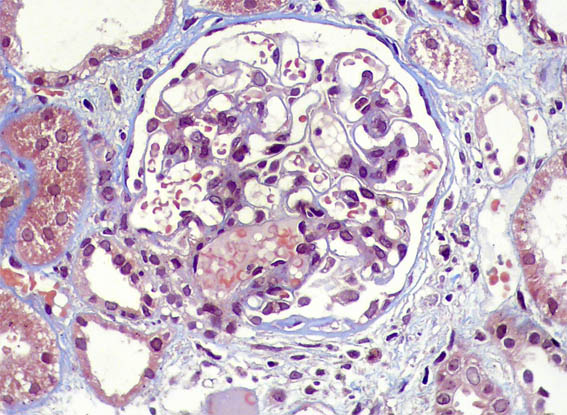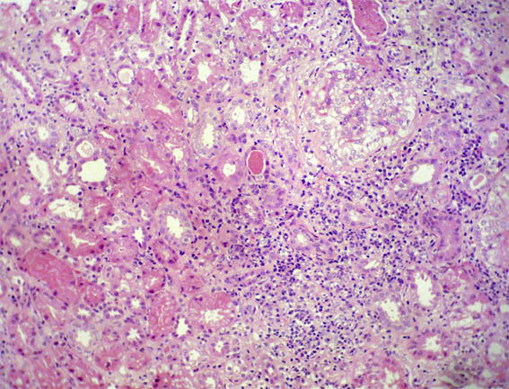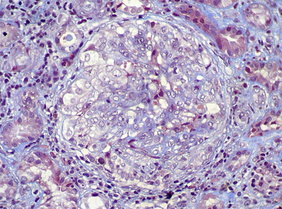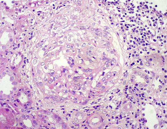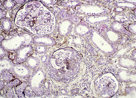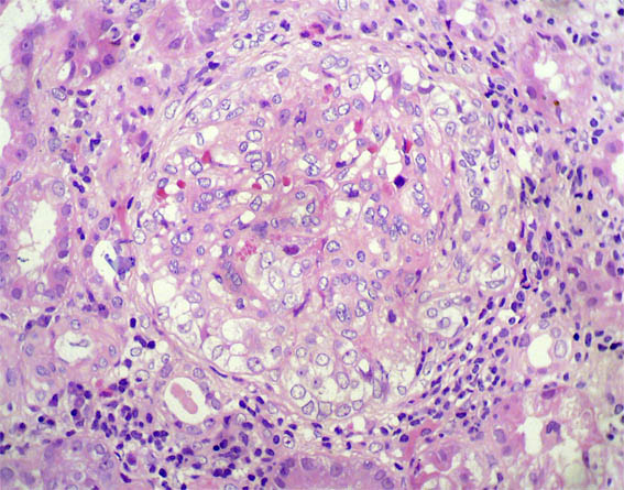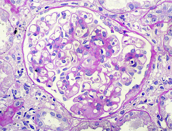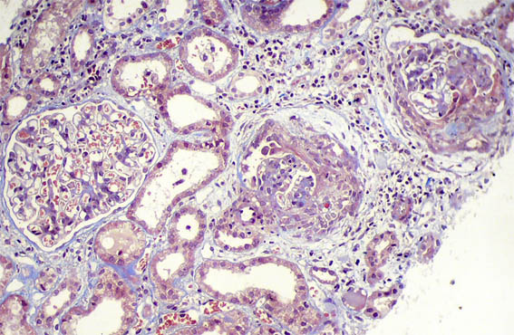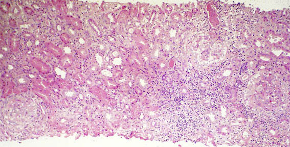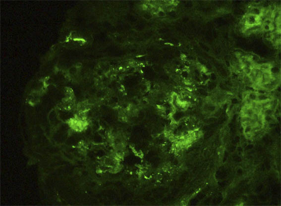 In laboratory tests: creatinine 2.8 mg/dL (0.9 mg/dL three months before). Urinalysis: RBC: 50-60 per high power field (HPF), leukocytes: 5-7/HPF, proteinuria 300 mg/dL, 2.2 g/24h. Studies of autoimmunity: negative; serum complement: normal. Test for viruses: negative.