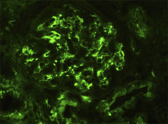 No other medical history and no known family history of renal disease. At physical examination edema in lower limbs and mild facial edema. BP: 150/90, no fever, no skin lesions. No other alterations.