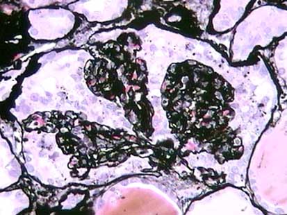Figure 2. With methenamine-silver stain the segments with loss of the capillary structure and sclerosis are better seen. The podocytes that cover these segments present hypertrophy and hyperplasia. (Methenamine-silver, X400).