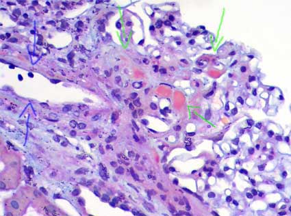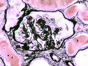 The term collapsing glomerulopathy (CG) is now more extensively used that "collapsing variant of FSGS". CG is not only a glomerular or podocyte disease, but all renal epithelial cells may be affected. The degree of tubulointerstitial damage varies from case to case and appears more pronounced in those forms where intrinsic epithelial cell damage, such as viral infection, is the related factor (Albaqumi M, Barisoni L. Current views on collapsing glomerulopathy. J Am Soc Nephrol. 2008;19(7):1276-81. [PubMed link]). Attempts to identify pathogenic mechanisms in CG have raised a number of hypotheses; however, the mechanisms through which these disorders lead to diffuse podocyte injury are poorly understood. Some investigators have focused their attention on the mitochondria. Mutations in genes encoding proteins involved in the mitochondrial respiratory chain may lead to CG in both mice and humans. Given the crucial role of oxygen availability in mitochondria metabolism, these data suggest that podocytes may be highly sensitive to hypoxic conditions. Recent evidence that hypoxia-inducible factor upregulation in podocytes leads to their proliferation and dedifferentiation in HIV associated nephropathy is striking. Injured podocytes show loss of some podocyte markers, induction of expression of some molecules and transdifferentiation to macrophage lineage (Canaud G, et al. Glomerular collapse associated with subtotal renal infarction in kidney transplant recipients with multiple renal arteries.Am J Kidney Dis. 2010 Mar;55(3):558-65. [PubMed link]).