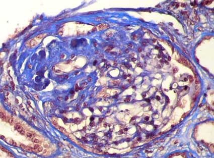 Figure 1. Glomerular tuft segmental sclerosis in the superior half; segments in the inferior half display mesangium and capillary walls and lumens with conserved architecture. (Masson’s trichrome, X400).