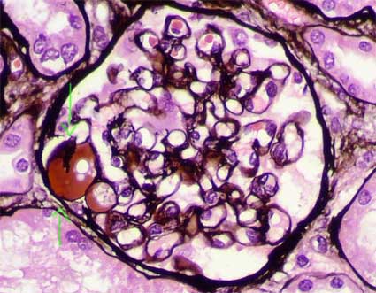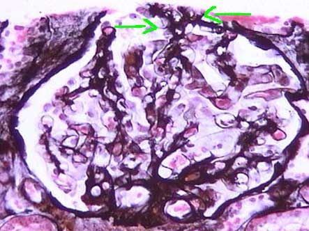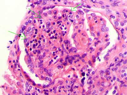 Figure 9. The arrows indicate a segment with increase of the cellularity and diminution or loss of the capillary lumina; the hypercellularity is due to proliferation of intrinsic glomerular cells and inflammatory cells that have migrated to the tuft, in this case mononuclear (lymphocytes and monocytes). Sometimes we can find polymorphous. In the case of the microphotography we found segmental and focal sclerosing lesions, NOS type, in 4 of 18 glomeruli, and only one (the one of the photo) with features of hypercellular variant. (H&E, X400)..
