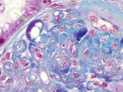Figure 8. In this microphotography, we see a glomerular arteriole (blue arrows), in the tuft there are hyaline segments in its vascular pole (green arrows). The perihilar variant characterize by al least one glomerulus with perihilar hyalinosis (as seen in this image), accompanied or not by sclerosis, and more than 50% of glomeruli with segmental lesions must have sclerosis and/or perihilar hyalinosis. There must not be glomeruli with collapsing or hypercellular lesions. (Mason’s trichrome, X400).