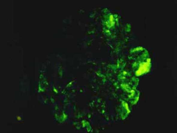 Figure 7. The immunofluorescence shows equally focal and segmental deposits of IgM and C3; these deposits probably are not pathogenic, but they correspond to unspecific deposition of serum proteins. (Direct immunofluorescence with antibodies anti-IgM, marked with fluorescein, X400).
