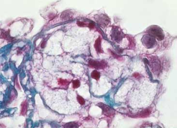 Figure 6. Large cells, with clear or vacuolated cytoplasm and small nuclei. These cells are frequent in FSGS, but they can be seen in any glomerulopathy causing NS: “foam cells”. (Masson’s trichrome, X1000).
