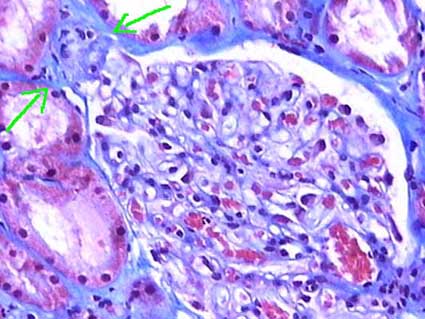 It is frequent to find areas with tubular atrophy, inflammatory interstitial infiltrates and fibrosis. The severity of the tubule-interstitial chronic damage correlates well, like in other glomerulopathies, with the severity of the renal damage and with the progression to terminal renal failure. In tubules is frequent to find, like in any other cause of NS, PAS positive resorption droplets. Frequently there is some degree of arterial intimal fibrosis and hyaline arteriolosclerosis, mainly in adults.