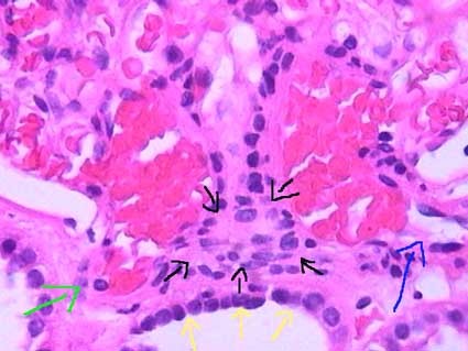 Figure 11. The juxtaglomerular apparatus is demonstrated here perfectly. The yellow arrows indicate the macula densa, see the apical nuclei. Almost in contact with macula densa cells is the extraglomerular mesangium with the Lacis or Goormaghtigh cells, indicated with the black arrows. The green arrow marks the efferent arteriole and the blue arrow the afferent arteriole. The Peripolar cells are located exactly in the angle in which parietal epithelium contacts visceral epithelium (H&E, X.400).