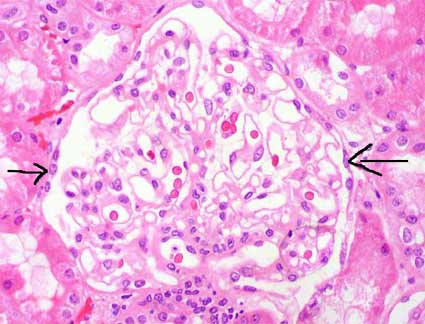 Figure 1. Normal glomerulus. See the cellularity of the glomerular tuft. The arrows indicate nuclei of parietal epithelial cells covering the Bowman’s capsule. In vivo the Bowman’s space is narrower than seen in conventionally processed tissue. (H&E, X300).
