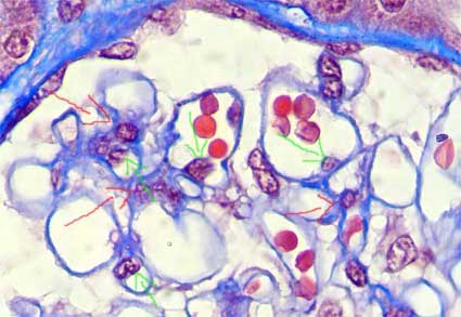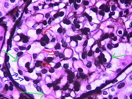 Figure 3. In this image of a lobule of the glomerular tuft, the red arrows indicate several mesangial areas in which there are 1 or 2 nuclei. The green arrows indicate nuclei of endothelial cells (Masson’s trichrome, X400).