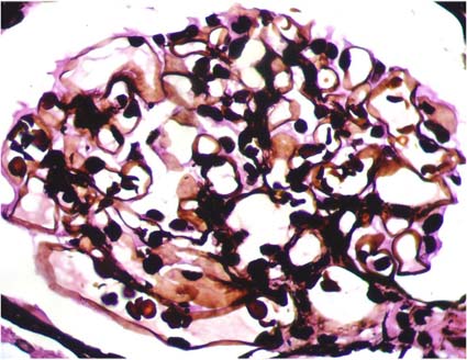 The glomerular tuft is formed by lobules of capillaries. The afferent arteriole gives origin to 4 - 8 capillaries, each one of which is subdivided to form a lobule. In each lobule there are several mesangial areas: the portion of mesangium that support several capillaries. It is very important to recognize the mesangial areas to determine when there is or non hypercellularity: cluster of three or more nuclei per mesangial area in thin 2 to 3 micron sections away from the vascular pole (Figure2 and Figure 3).