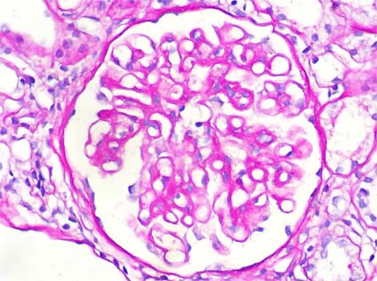 Figure 5. The mesangial matrix also stains with the PAS, like the basal membranes, due to the affinity of PAS by type IV collagen (PAS, X300).