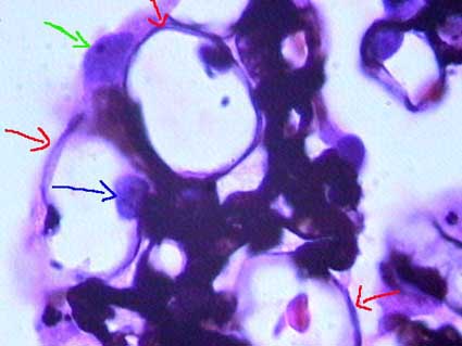 Figure 6. With methenamine-silver stain the GBM is thin and smooth (green arrows); this is a good technique to see its structure. The blue arrows indicate nuclei of podocytes, the cytoplasm is flat and it does not allow to delimit itself clearly with the optical microscopy. The red arrows mark some mesangial areas and nuclei of mesangial cells. (Methenamine-silver, X400).
