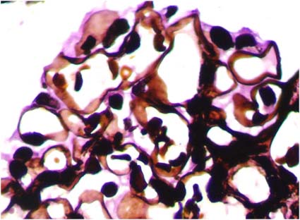 Figure 4. The mesangial matrix, like the basement membranes of capillaries, Bowman’s capsule, and tubules are rich in type IV collagen, and has affinity by the methenamine-silver stain. See the irregular characteristic aspect of mesangial matrix (in black) in a normal glomerulus (Methenamine-silver, X.400).