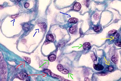 Figure 9. In this image the capillary walls, the podocytes (green arrows), nuclei of endothelial cells (blue arrows), mesangial cells (yellow arrows), and parietal epithelial cells (red arrows) are well evidenced. (Masson's trichrome, X.400).