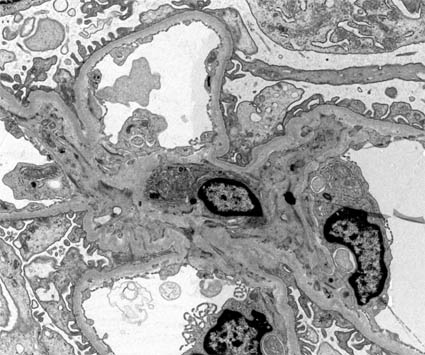 Figura 10. Electron microscopy. Normal glomerulus. In the center a mesangial area in which the nucleus of a mesangial cell (by its location) is recognized, it is surrounded by three capillaries. Note the basement membrane surrounded by podocyte processes. (Original magnification, X2.000).