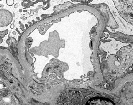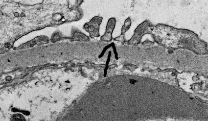 Figure 10c. Electron microscopy. podocyte processes are more clearly identified. One slit-diaphragm is marked with the arrow. Foot process effacement is a common feature in any cause of nephrotic syndrome, although it is the main alteration in minimal change disease. Slit-diaphram is anchored to the cytoskeleton of the podocyte, and there are many protein that are very important to the normal function (nephrin, podocyn, CD2AP, NEPH1, NEPH2, and so on; see the chapters on focal segmental glomerulosclerosis and minimal change disease).