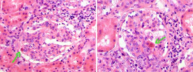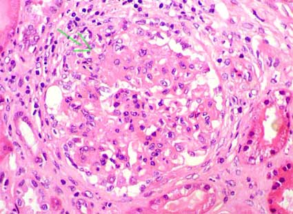 Figure 4. Hematoxylin bodies (arrows) are the histologic representation of the LE cells, they are extremely uncommon (approximately found in 2% of biopsies with lupus nephritis) and they are considered as pathognomonic of lupus (H&E, X400).