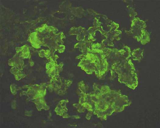 The etiology of the disease is not well-known. Genetic, infectious, hormonal, and other environmental factors seem influence on its pathogenesis. Some cases are related to hereditary deficiencies of the complement and others can be induced by drugs. The development of autoimmunity has been attributed to inadequate elimination of autoreactive lymphocytes. A dysregulation of the apoptosis and inadequate removal of apoptotic cells and nuclear rests seem important in the pathogenesis (Stuart L y Hughes J, Nephrol Dial Transplant 17:697, 2002 [PubMed link] [Free-Full-text]). The renal damage can be secondary to activation of the complement and local liberation of proinflammatory cytokines. Some intrarenal antigens, like components of the extracellular matrix and glycoproteins, can serve as target of the autoimmune attack. Deposition of circulating immune complexes with local activation of inflammation is another recognized mechanism of tissue damage. In addition, antiphospholipid antibodies can promote thrombosis or vascular injury. In lesions with membranous features (class V) there is cytotoxic injury of podocytes by antibodies and complement.