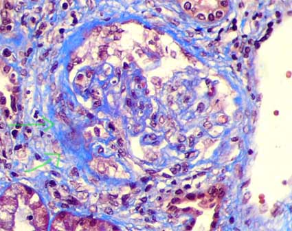 Figure 7. In this lupus nephritis case, class III, we can see several segments with endocapillary proliferation (one of them signaled with the green arrow) and two small segments with fibrinoid necrosis in which fuchsinophilic material is identified (red arrows). The necrotizing lesions are associated with a clinical course of severe renal involvement and with greater probability of chronic glomerular changes. (Masson’s trichrome, X400).