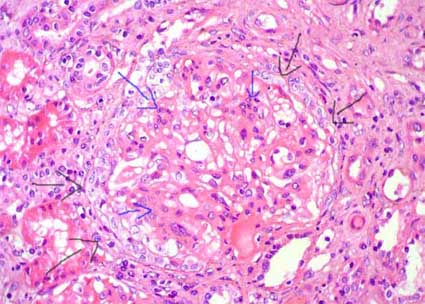 Figura 5. Mismo caso de la microfotografía anterior; observe el penacho comprimido por una semiluna epitelial circunferencial (flechas negras); hay proliferación mesangial celular y de la matriz (flechas azules). Este caso corresponde al de una mujer de 32 años con episodios de hematuria macro, en el último, previo a la bopisia, presentó además elevación de la creatinina. Las semilunas extensas en NIgA se asocian con un curso clínico más agresivo. (H&E, X400).
