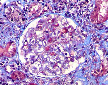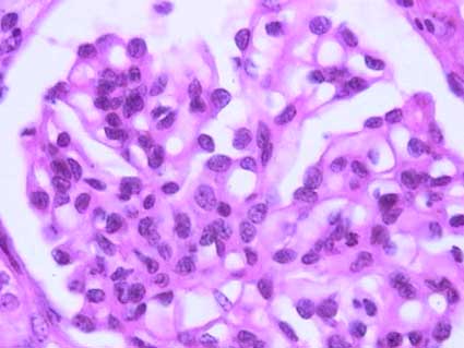 Figura 2. La hipercelularidad mesangial se ve más claramente en este glomérulo de un paciente de 45 años con nefropatía IgA. (H&E, X400).