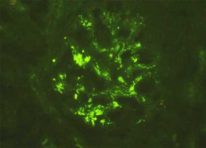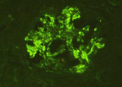Figura 6. La característica fundamental en la NIgA es la inmunotinción mesangial intensa, difusa, para IgA. Observe que la positividad se limita, en este caso, a los tallos mesangiales, sin comprometer las paredes capilares; esta microfotografía representa el típico patrón mesangial (Inmunofluorescencia con anticuerpos anti-IgA marcados con fluoresceina, X400).